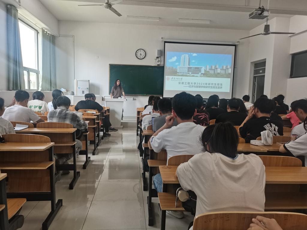 程幼明从安徽工程大学的校园环境、学科建设、科学研究、办学条件、师资队伍、区位优势等多个层面,介绍了学校的基本情况。他重点讲解了经济与管理学院的师资力量、科研成就、硕士培养等情况。最后他结合经济与管理学院招生专业政策、复习科目、报考条件及奖助政策做了详细介绍,并督促同学们提前做好规划,争取取得优异成绩。