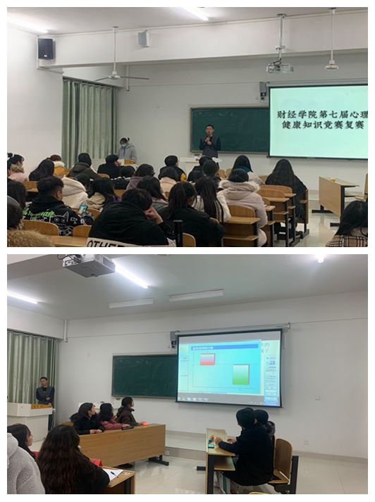 复赛于12月9日晚在致知楼B206进行。复赛分为两轮,第一轮是个人赛,55名同学依次进行答题 ,15名胜出者进入第二轮小组赛,小组赛为三人一组进行现场竞答,答题环节包括单选题、多选题、填空题、判断题和简答题。比赛现场气氛热烈,经过激烈的角逐,最终两支队伍胜出,胜出的两组同学将代表财经学院参加校第五届心理健康知识大赛。