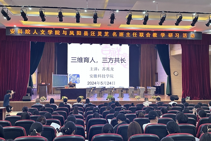5月24日下午,凤阳县第三中学报告厅,人文学院中文系主任苏兆龙应邀为凤阳县汪灵芝名班主任工作室成员及凤阳三中广大师生作《三维育人,三方共长》专题微讲座。