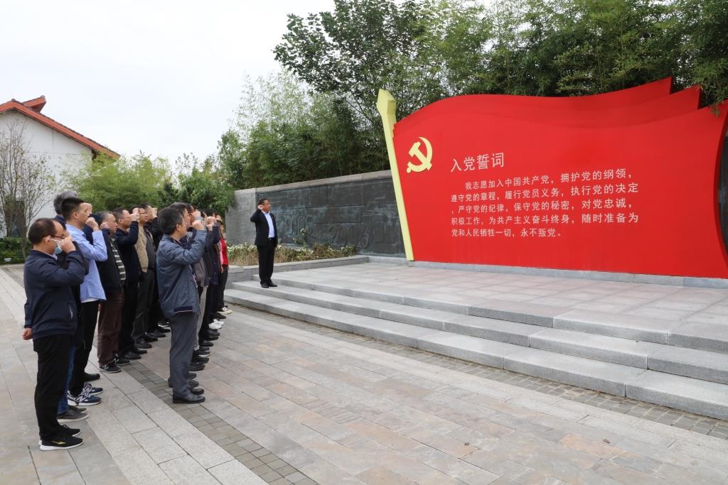 在沈浩同志事迹陈列馆前,三个支部党员举行了重温入党誓词仪式。在鲜红的党旗下,全体党员佩戴党员徽章,举起右手,握紧拳头,庄严宣誓。